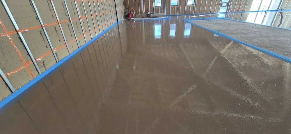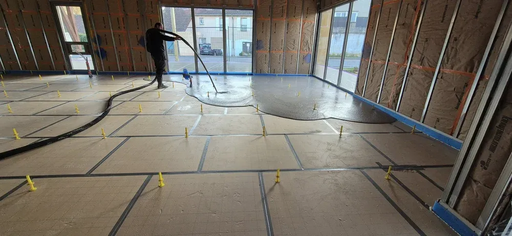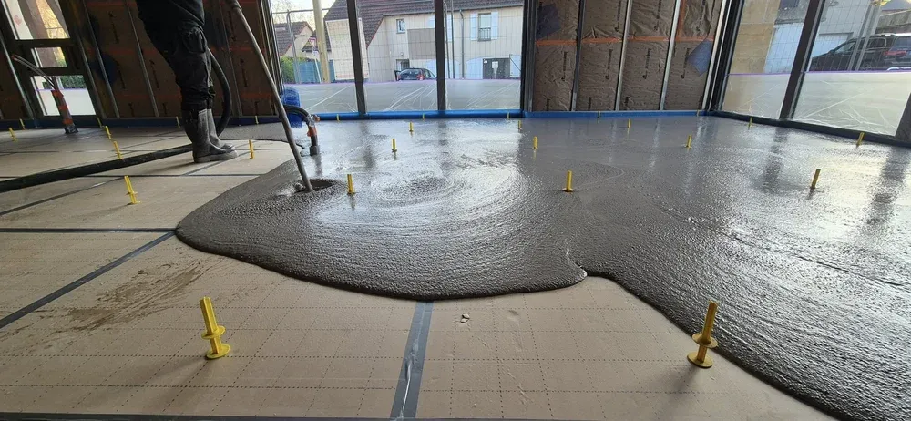Après l'isolation, nous avons coulé une chape liquide anhydrite classic. Ce type de chape est reconnu pour sa capacité à offrir une planéité parfaite, essentielle pour les revêtements de sol ultérieurs. Grâce à notre savoir-faire, nous garantissons une mise en œuvre rapide et efficace, tout en respectant les délais convenus.